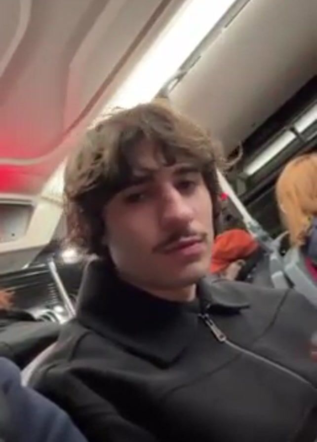 Two young men ride on public transport. The first subject has wavy brown hair and a mustache, wearing a black jacket. He faces the camera and gives the peace sign. He shifts the camera to the person sitting next to him. The second person wears a black baseball cap and a black puffy jacket. The shot is taken from a low angle, looking up at the men. The ceiling of the transport is white with linear lighting, and other passengers are visible in the background.