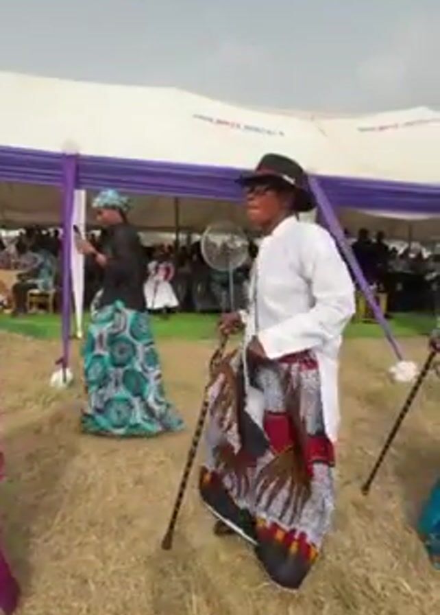 person in a white shirt, a patterned wrap-around skirt, a black hat, and sunglasses dancing in front of a large white tent. The tent has purple accents and the words "OBOH RHTS RENTALS" printed on the side. Other people are visible, some wearing patterned skirts and headwraps. There are chairs and tables inside the tent. The ground is covered in dry grass. The person dancing uses a cane as part of their dance moves, waving it and stepping rhythmically. Music plays in the background.