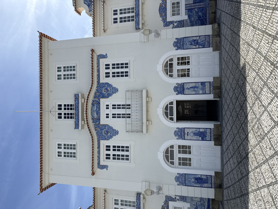The image displays the facade of the historic Aveiro train station (Estação Ferroviária de Aveiro) in Aveiro, Portugal