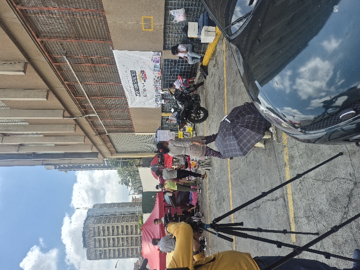 A street scene features various elements. A banner hangs on a building beside people, tables, and a red tent. Some individuals carry umbrellas. A motorcycle is parked nearby. A car is visible on the right. A tripod is set up in the foreground. Tall buildings are visible in the background. A yellow square is painted on the wall. Overall, the image depicts an outdoor event or market.