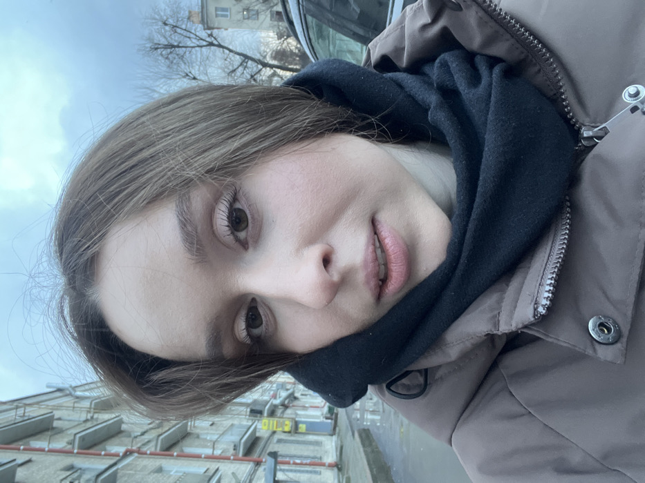 A young adult female is captured in a selfie on a city street in Minsk, Belarus