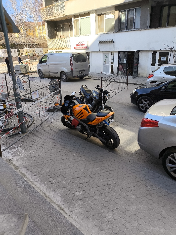 The image portrays an urban street scene in Plovdiv, Bulgaria, observed during daytime under clear weather conditions. In the immediate foreground, a hexagonal-patterned concrete sidewalk is visible. Parked on this sidewalk are two motorcycles: an orange sports motorcycle prominently featuring "REPSOL" branding and a Bulgarian license plate "PB N 8400," positioned in front of a darker, presumably black, motorcycle. To the left of the motorcycles, a construction zone is sectioned off by a black mesh barrier, encompassing a utility pole, segments of red and white striped caution tape, and construction materials such as pipes. The street adjacent to the sidewalk is occupied by several parked vehicles, including the rear section of a silver sedan, a black sedan, a white compact car, and a light gray Ford Transit-style van. In the background, a multi-story building with a light-colored facade is present. Its ground floor hosts commercial establishments, identifiable by a white-fronted shop with a glass door and window, and an adjacent dark entryway secured by a metal gate. A sign with the Cyrillic text "ИЗДАВА ПЛЮС" is affixed to this building. The upper floors feature balconies and windows. Further in the distant background, to the left, an elevated, undeveloped or construction area is visible, characterized by stacked concrete slabs and several bare trees. Two human figures are indistinctly perceived within this distant construction zone. No direct actions or interactions are clearly discernible among the foreground subjects.