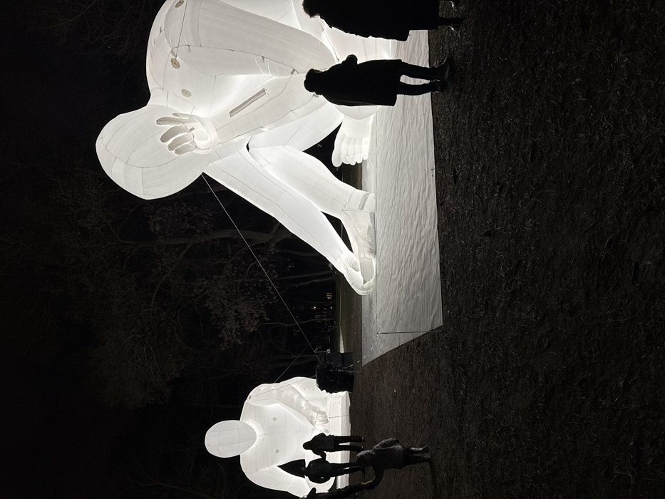 The image depicts an outdoor night scene within Borisova Gradina Park, Sofia, Bulgaria. Two large, internally illuminated white inflatable sculptures, designed to resemble human figures, are the central subjects. The prominent sculpture on the right is a large figure seated with its head bowed and hands near its face, positioned on a white ground tarp. A second, smaller, similarly illuminated figure is visible in the mid-ground on the left, also situated on a white tarp. The background consists of dark, silhouetted trees against a black night sky. Several individuals are present: two adult figures stand in silhouette in the right foreground, observing the larger sculpture. In the left mid-ground, two additional adult figures and a small child are visible near the base of the smaller sculpture. The child, wearing a light-colored jacket, is captured in motion, walking away from the viewer towards the left sculpture. The ground is dark, appearing to be grass or dirt.