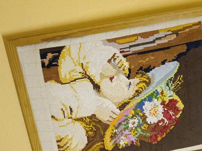 - "A framed needlepoint tapestry is depicted, oriented at an oblique angle against a light yellow wall in Levice, Slovakia" by FM-5APGX2, licensed under CC BY 4.0