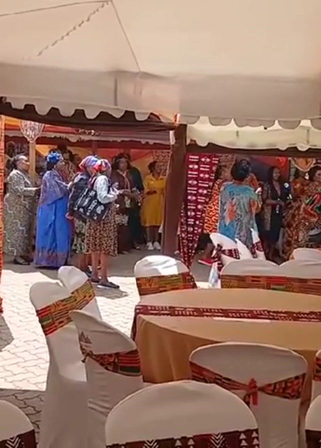 n outdoor event, possibly a wedding or celebration, taking place under a white tent. Several round tables are draped in tan cloths and decorated with patterned runners, surrounded by white chairs adorned with matching fabric sashes. Numerous people are standing and chatting, many dressed in colorful traditional clothing. A few individuals are taking photos or videos of the gathering. The ground is paved with light-colored stones, and the surrounding architecture suggests a building with stone walls.