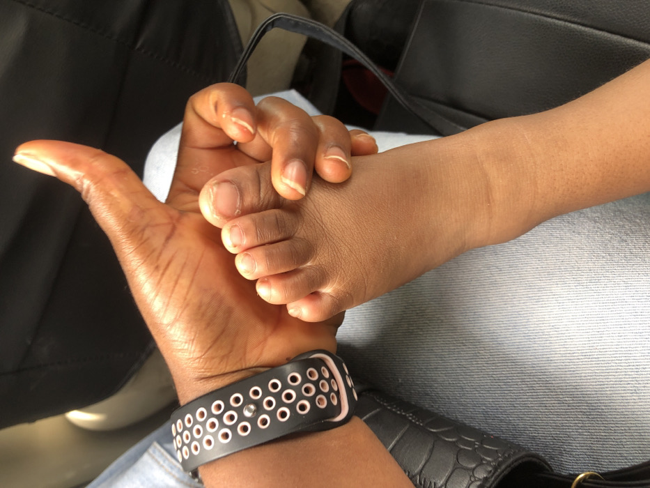 A dark-skinned hand is holding a dark-skinned foot. The hand’s thumb is extended upwards. The foot’s toes are aligned with the hand’s fingers. A black and pink wristband is visible on the wrist, sitting atop a light-wash denim surface. Black leather bags are positioned in the background, and the interior of what appears to be a car is also visible.