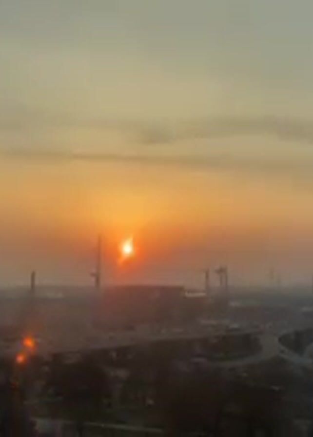 cityscape at sunset or sunrise. The sun is low in the sky, partially obscured by clouds or haze, casting a warm, orange glow over the scene. In the foreground, there are buildings of varying heights, a network of highways with visible traffic, and some trees. In the distance, there are bridges spanning a river. The overall atmosphere is hazy and slightly obscured, which may be due to pollution or atmospheric conditions.