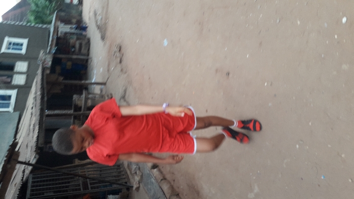 A person wearing a red t-shirt and red shorts with white trim stands on a dirt-covered road. The person also wears red and black sandals. A multistory building with white-framed windows is to the left. The area also features makeshift structures with corrugated metal roofs.