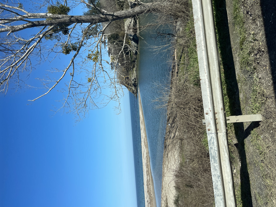 The image displays a coastal scene in Kiten, Bulgaria, characterized by a bright, clear blue sky overhead. In the immediate foreground, a weathered, galvanized metal guardrail with visible rust spots extends horizontally across the lower portion of the frame, supported by metal posts. Beneath the guardrail, patches of dry grass and dirt are visible, suggesting a roadside verge. Beyond the guardrail, the landscape transitions into a natural environment. A sandy beach or spit forms a natural barrier, separating a calm, dark blue body of water, likely a river estuary or lagoon, from the lighter blue open sea. The sea extends towards the horizon on the left. On the right, a rocky headland or cliff rises from the water, covered with sparse, dry vegetation and several leafless deciduous trees. Perched atop this cliff, a multi-story building with a modern architectural style, featuring white walls and multiple terraces, is visible. A prominent, leafless deciduous tree stands in the mid-right foreground, its bare branches reaching upwards. Several clusters of green mistletoe are clearly visible clinging to its branches. The overall environment suggests a clear, possibly cool day, given the bare trees, with ample natural light illuminating the scene. No individuals, vehicles, or explicit actions are present within the frame.