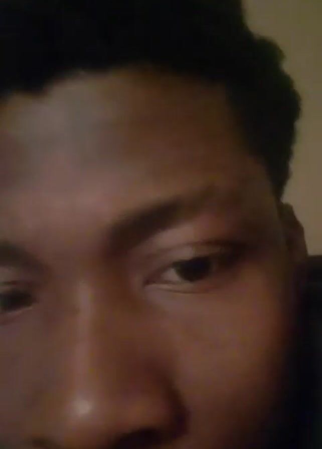 A man with dark skin and a short afro is sitting in a room. He's wearing a dark green shirt. The room is dimly lit. A portion of a window with blinds is visible in the background, as well as some items on a shelf. He looks at the camera. Music is playing.