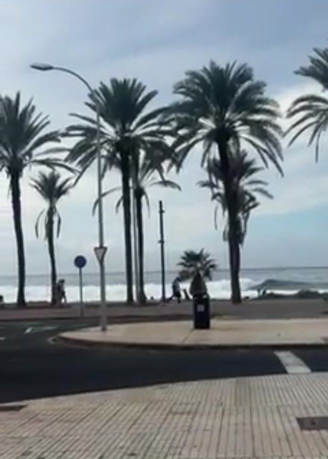 coastal scene with several palm trees along a street. The sky is overcast, and the ocean has visible waves. People are walking along the beach and sitting on benches. A black trash can and various street signs are also visible.