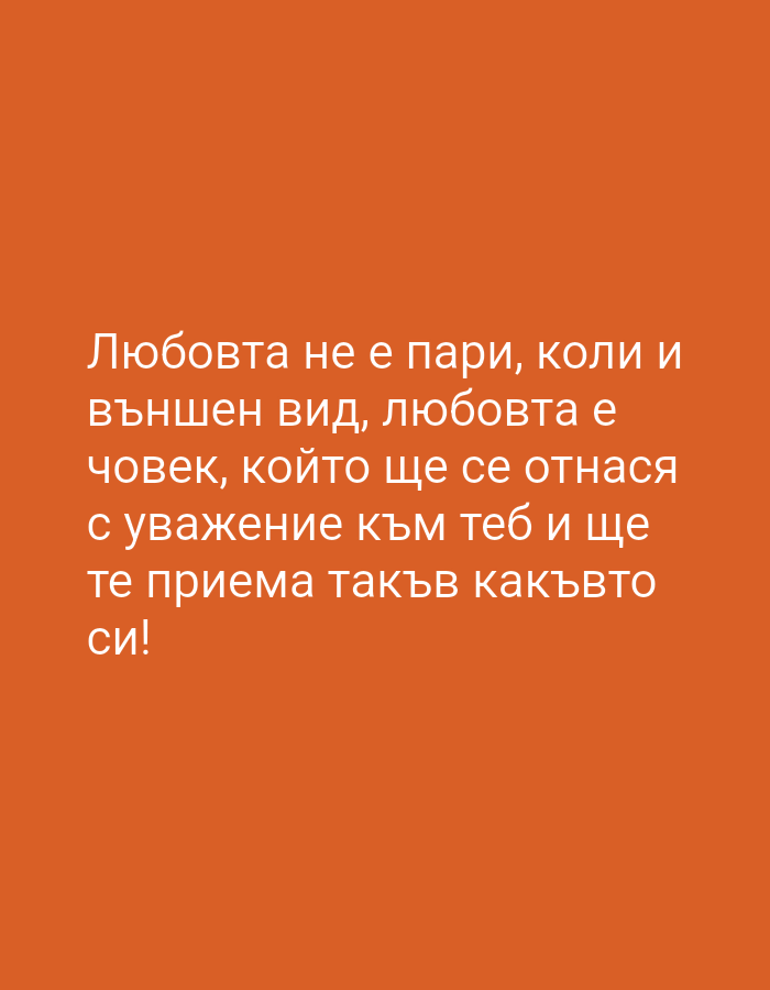 The image is a digital graphic featuring white Cyrillic text centered on a solid orange background. The text translates from Bulgarian as: "Love is not money, cars, and outward appearance; love is a person who will treat you with respect and will accept you as you are!" No physical location in Drenovets, Bulgaria, or any other city is depicted within this digital image, which consists solely of text on a colored background. No people, specific objects, actions, or interactions are visually represented.