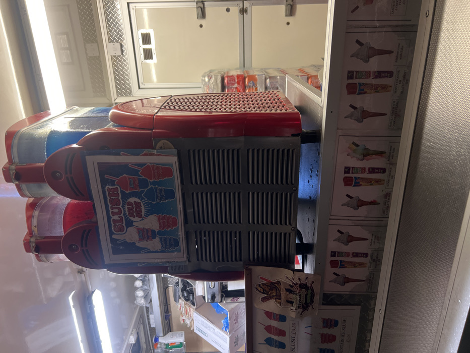 The image depicts the interior of what appears to be a mobile catering unit or food stall. Dominating the center is a red slush machine with three clear dispensers on top. Two dispensers contain a red liquid, while the third holds a blue liquid. Attached to the front of the machine is a sign titled "SLUSH SOLD HERE," displaying illustrations of various slushy drinks including vanilla, raspberry, and strawberry flavors. Below the slush machine, on a metallic counter, is a display of additional menu items. This includes a sign advertising "SLUSH £3.50" and an "Ice Cream Special" poster featuring a sundae. Further along the counter, multiple framed images showcase different ice cream cones and packaged ice lollies, with descriptions like "SMALL CONE WITH CHOCOLATE FLAKE," "SUNNY ORANGE," and "MEDIUM CONE with flake." The background reveals the utilitarian interior of the unit. To the left, shelving holds various items, including white boxes, what appear to be cleaning spray bottles, and a blue plastic container. To the right, a two-part white service door or access panel is visible, set into a wall featuring a diamond plate texture common in commercial vehicles. Behind this door, stacked transparently wrapped packages of what appear to be red beverage cans are visible. Overhead, bright fluorescent tube lighting illuminates the scene. No specific identifying features indicating a precise location within the city of London, United Kingdom, are visible in the image.