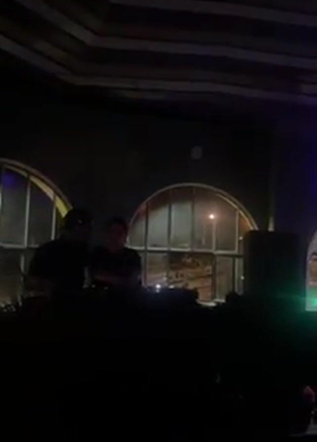 dimly lit interior, seemingly a club or bar, with two DJs standing behind equipment. They are facing towards the camera, likely performing. Above, the ceiling is decorated with a geometric pattern and a neon art fixture which changes color. Arched windows are visible in the background. A few other figures are present in the room, including at least one person walking past. The overall atmosphere is dark and club-like.