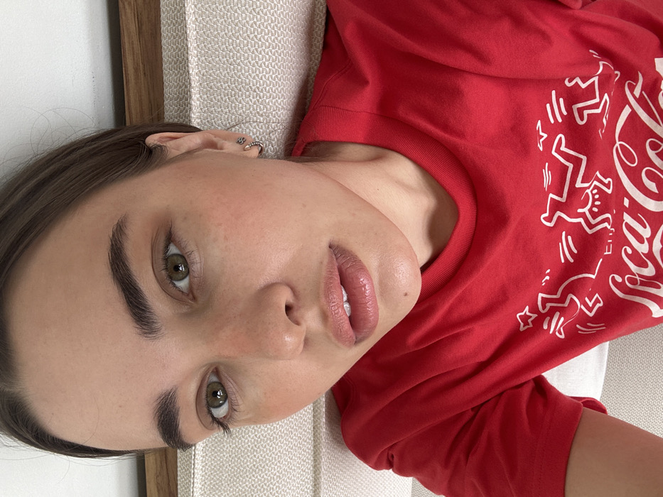 A woman lies on a light-colored, textured surface. She wears a red T-shirt with white Coca-Cola lettering and cartoonish figures. Her face is angled towards the camera, showcasing her hazel eyes, full lips with a glossy sheen, and strong, well-defined eyebrows. Small earrings are visible in her left ear. The lighting emphasizes her clear skin and natural makeup.