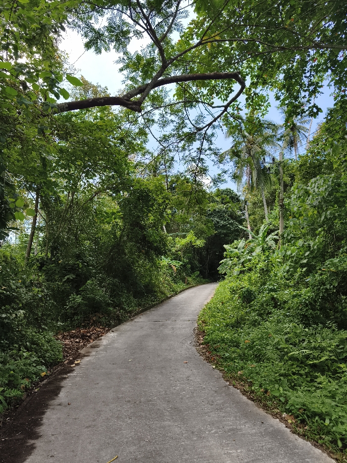 A narrow asphalt road curves gently between lush green foliage. Tall trees create a dense canopy overhead, revealing glimpses of a bright blue sky. The road surface is gray and appears worn, with some areas darker due to moisture or shadows. The surrounding vegetation is thick, featuring a variety of plants and small trees, evoking a tropical or subtropical environment. The scene gives a sense of tranquility and natural beauty.