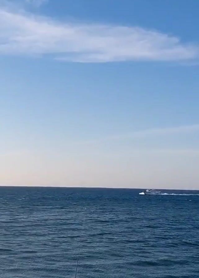 The video captures a serene daytime scene on the water. In the foreground, a fishing rod extends into the frame, hinting at someone fishing. The main focus of the video is the vast expanse of the dark blue ocean, which is gently rippling. A boat is visible in the distance, creating a white wake as it moves across the water. The sky is clear blue with a few thin, white clouds adding depth to the scene.