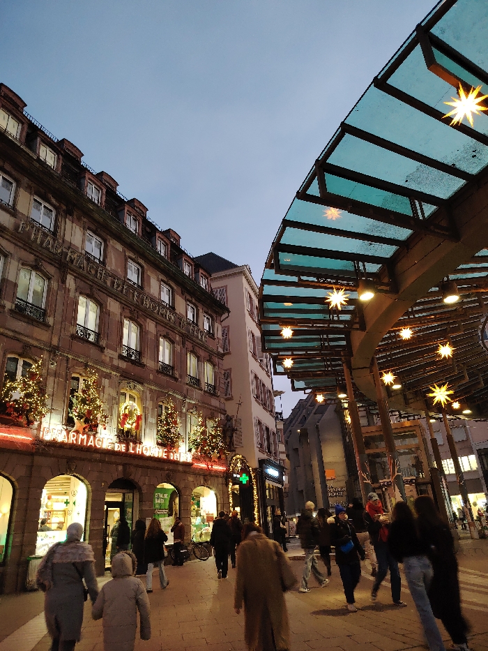 The image depicts an outdoor pedestrian scene at dusk or early evening, located at Place de l'Homme de Fer in Strasbourg, France. On the left, a multi-story historic building with an ornate brown facade features numerous windows with white frames and black railings, and multiple dormer windows along the roofline. Its ground floor is identified as "PHARMACIE DE L'HOMME DE FER" by illuminated red lettering. The building is extensively decorated with several small, illuminated Christmas trees adorned with golden lights and red bows, affixed to the facade, along with a large central golden wreath with red ribbons. A green cross sign, characteristic of a pharmacy, is visible to the right of the main entrance. On the right, a modern architectural structure with a teal-tinted glass canopy extends overhead. This canopy is supported by dark metal framework and features multiple suspended, illuminated star-shaped lights that emit a warm yellow glow. Some of these lights are reflected on the wet glass panels of the canopy. Beyond this structure, other commercial buildings with illuminated interiors are visible. The street level is a paved pedestrian area, appearing somewhat damp or reflective. Approximately 20-30 individuals are present, walking in various directions. Most are dressed in winter coats, jackets, and scarves. In the immediate foreground, a person in a grey coat walks away from the camera, holding hands with a child in a lighter grey coat. Another person in a long brown coat walks towards the camera. A bicycle is parked near the pharmacy entrance. The overall scene is illuminated by artificial lights from buildings and street decorations against a twilight blue-grey sky.