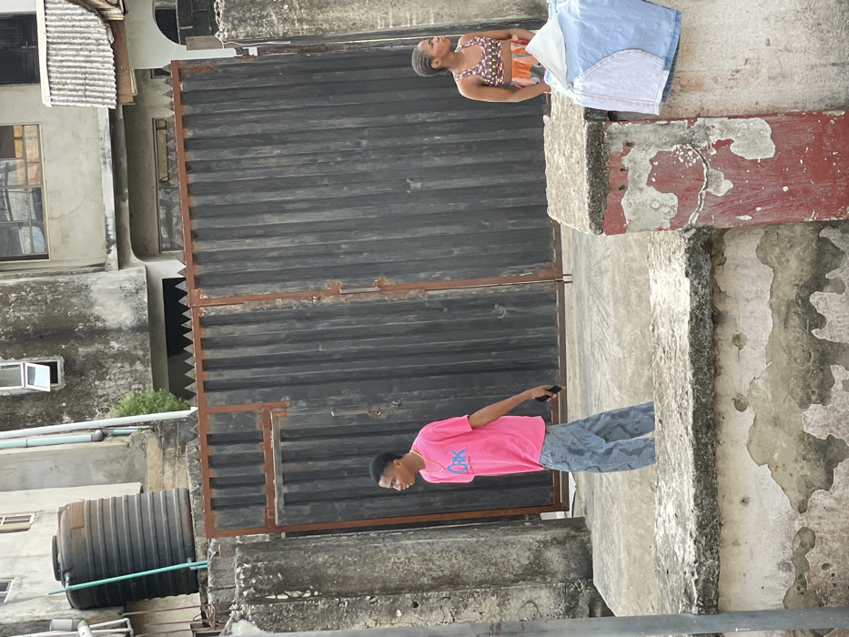 This image depicts a street scene in Iranla, Nigeria, featuring two individuals against a backdrop of urban structures. In the left-center, a male individual with dark skin and short dark hair walks from left to right, his gaze directed towards the right side of the frame. He wears a bright pink t-shirt with a white logo and light blue baggy jeans. A gold-colored chain is visible around his neck, and he holds a dark smartphone in his right hand. To the right, a female individual with dark skin and dark hair pulled back stands facing right, looking off-frame. She wears a multi-colored patterned crop top or sports bra (featuring brown, orange, white, and black geometric patterns) and an orange and white patterned skirt or shorts. The immediate background is dominated by a tall, closed, dark grey corrugated metal gate with a rusty brown frame and pointed anti-climb spikes along the top. Behind the gate and to the left, a large black corrugated plastic water tank is mounted on a concrete platform, connected by a light green pipe. Behind the gate, multiple concrete buildings with varying window styles are visible, exhibiting signs of wear and staining. The foreground features concrete walls and pillars. The wall on the right has a red painted base with significant peeling, revealing worn concrete beneath. A light blue garment and a white garment are draped over this wall. The ground in the mid-distance is paved concrete. No direct interaction between the two individuals is observable.