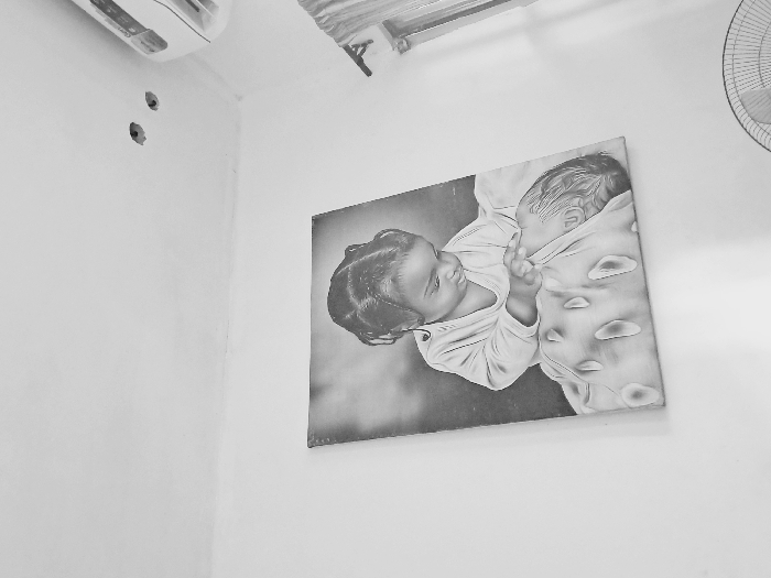 The scene is an interior room within a building in Ado, Nigeria. A large, vertically oriented, monochrome artwork is mounted on a plain white wall. The artwork depicts two infants. An older infant, characterized by dark braided hair and a long-sleeved top, is positioned in the upper portion, looking down and extending its right hand towards a younger infant. The younger infant lies on its back, partially covered by a blanket with multiple raised, elongated contours. Above the artwork, the white ceiling exhibits two small, dark circular indentations. An air conditioning unit is mounted on the upper right portion of the wall, near the ceiling. To the immediate right of the artwork, a window frame with a light-colored curtain is partially visible. The upper arc of a white circular fan grill is present in the lower right corner of the image.