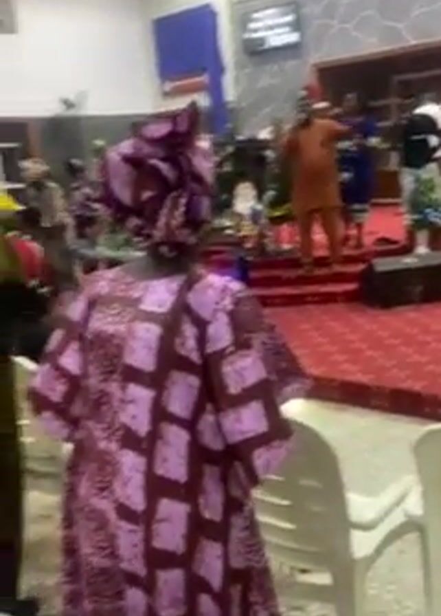 church service in progress. Several people are on the stage at the front, one appearing to sing into a microphone. The congregation is visible in the foreground, dancing and moving around in the aisles, with white plastic chairs visible as seating. The interior of the church is bright and airy, with high ceilings and fans. Most of the congregants are wearing colorful traditional African clothing.