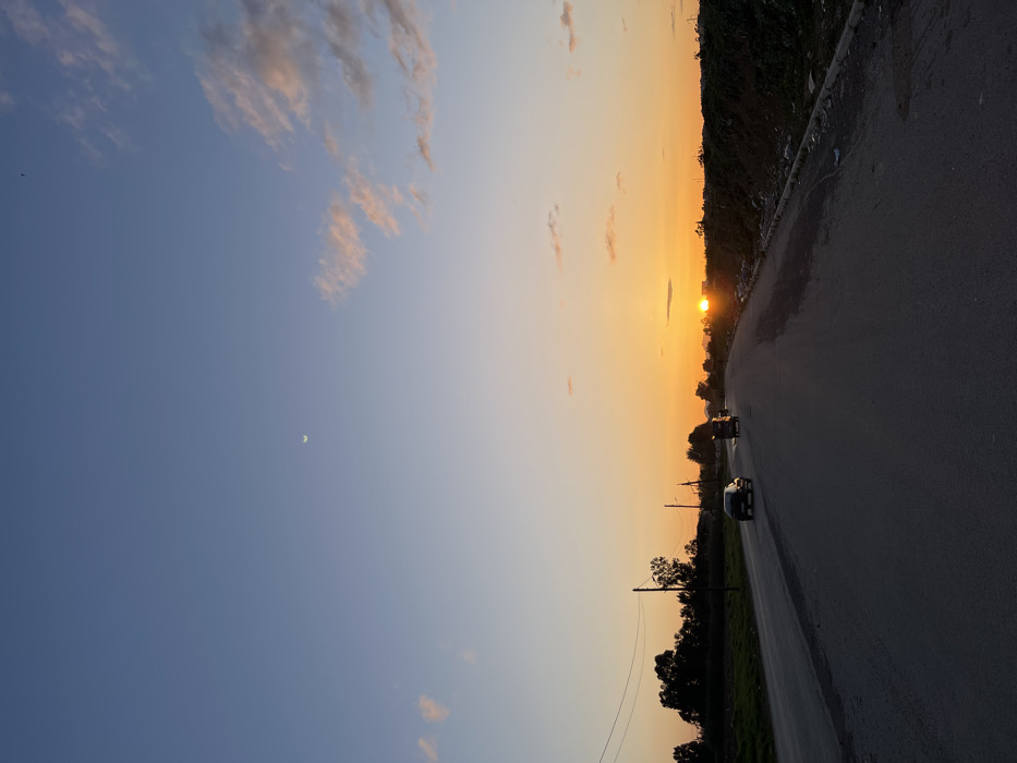 This image captures a rural or semi-urban road scene in Fez, Morocco, during sunset. The low sun, a bright orange-yellow orb, is situated on the distant horizon line, casting a warm glow across the lower sky which transitions from deep blue overhead. A thin crescent moon is visible in the upper left quadrant of the blue sky, alongside scattered, wispy clouds exhibiting faint orange and pink hues. The asphalt road stretches into the distance, appearing worn, with two lanes implied. Two vehicles are visible, moving away from the viewer towards the sunset: a dark-colored sedan on the left side of the road, and a second, darker, boxier vehicle positioned further ahead on the right side. The left roadside features green ground cover and a line of dark-silhouetted trees, interspersed with utility poles carrying overhead lines. The right roadside is characterized by a raised earthen embankment covered in dark vegetation and debris, including visible litter along the junction with the asphalt. No individuals are explicitly identifiable.