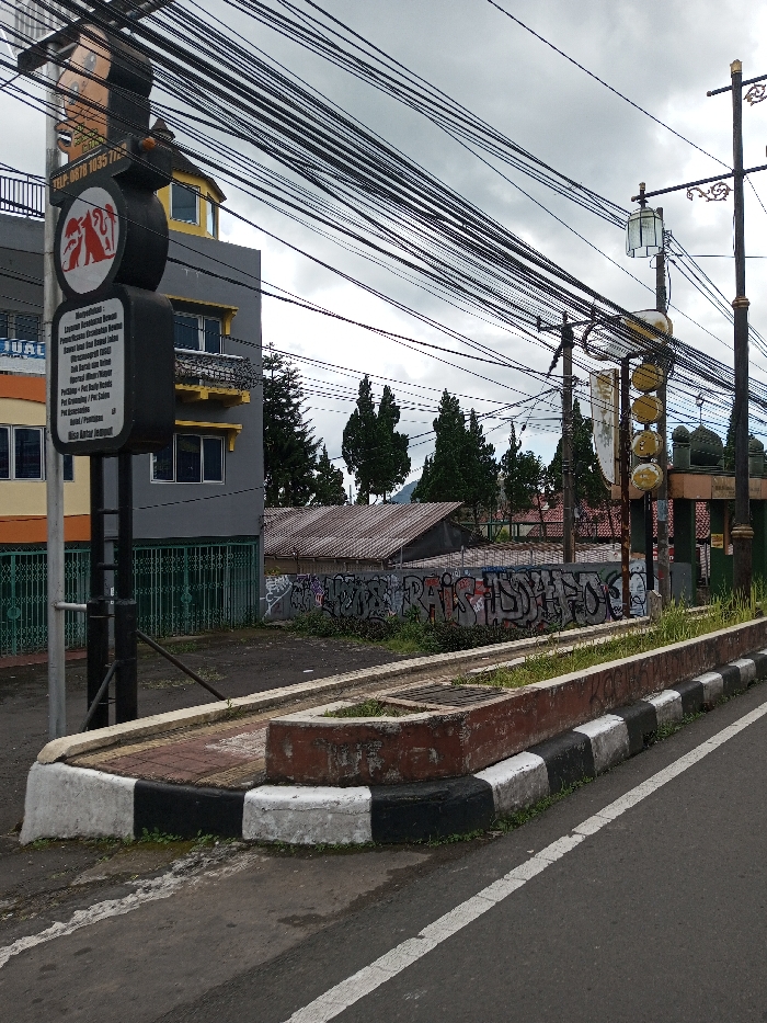The scene depicts an urban street corner in Taohom, Laos, under an overcast sky. In the foreground, an asphalt road with a solid white line runs alongside a concrete curb, painted with alternating black and white sections. This curb borders a raised pedestrian area featuring a rectangular, weathered reddish-brown concrete planter box containing sparse green vegetation. A metal grate covers a drain opening in the paved surface adjacent to the planter. To the left, a black pole supports multiple signs. The uppermost sign features a stylized human head silhouette above the text "TELP. 0878 1035 77XX". Below it, a circular sign displays white silhouettes of a cat and a dog on a red background. Further down, a rectangular black sign with white text is visible, partially obscured but showing phrases such as "Layanan Kesehatan Hewan," "Pet Shop," "Pet Grooming," "Mandi," and "Titip Hewan." Behind this pole, a multi-story building stands, its upper floors primarily grey with a yellow trim detail, and its ground floor featuring an orange section and a green metal gate. To the right of the pedestrian pole, a jumble of black utility wires crisscrosses overhead, supported by multiple utility poles, one of which has a cluster of five yellow circular lights and a glass-enclosed lantern fixture. Further right, another dark street lamp pole with decorative scrollwork and a lantern is present. In the midground, a series of lower-rise buildings with corrugated metal roofs are visible. A prominent wall separating the street from these structures is heavily covered in black and white graffiti. Beyond these buildings, a line of tall, slender evergreen trees is visible, with distant hills or mountains in the background. No individuals or animals are present.
