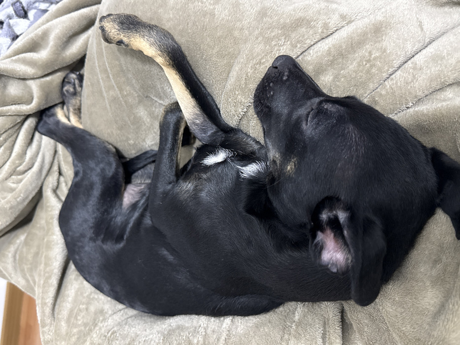 - "A black dog is curled up asleep on a plush, light brown blanket" by FM-rSR2K3, licensed under CC BY 4.0