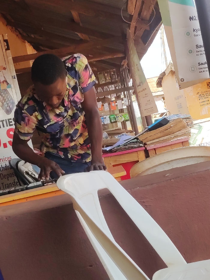 The image portrays a semi-enclosed commercial stall in Akwanga, Nigeria, under clear daylight conditions