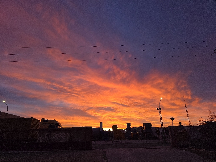 The image captures an urban-industrial scene at sunrise or sunset in Valverde del Majano, Spain. The sky dominates the frame, exhibiting a dramatic gradient from deep violet in the upper third to vibrant orange, red, and yellow hues along the horizon, punctuated by streaky cloud formations. Three dark, parallel horizontal lines, indicative of overhead power lines, traverse the upper portion of the sky. The lower third of the image is characterized by a dark, silhouetted landscape. In the mid-ground, on the left, are several dark, rectangular structures resembling industrial containers or buildings. Partially visible behind these is the dark silhouette of a truck's cab, identifiable by its shape and what appears to be a yellow body. A street lamp on a thin pole, emitting a visible light source, is positioned on the far left. Towards the right, a collection of dark, indistinct shapes suggests additional industrial structures or machinery. Another street lamp, similar in design and illuminated, is situated towards the right-center, mounted on a pole that also features multiple horizontal attachments. Bare tree branches are visible on the far right edge of the frame. The foreground consists of a dark, paved surface. No individuals or discernible activities are present.