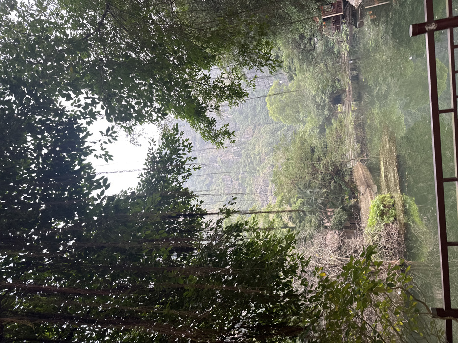 The image displays a panoramic natural landscape in Hoa Lư Ward, Vietnam, viewed from behind a dark brown wooden railing in the immediate foreground. The scene is framed by a dense canopy of lush green foliage and long, hanging vines that obscure the sky from above. A calm, greenish body of water, likely a lake or river, occupies the central midground, reflecting the surrounding trees and the overcast sky. Patches of dark green vegetation are visible on the water's surface. Along the left bank, a mix of vibrant green tropical trees and shrubs, alongside some trees with lighter, possibly bare branches, line the water's edge. On the right bank, a small, traditional wooden structure with a reddish-brown roof is partially visible among the dense greenery. In the background, majestic limestone karst mountains rise steeply, their rugged, vegetated slopes partially obscured by atmospheric haze or mist under a uniformly light gray sky. No human figures are present.