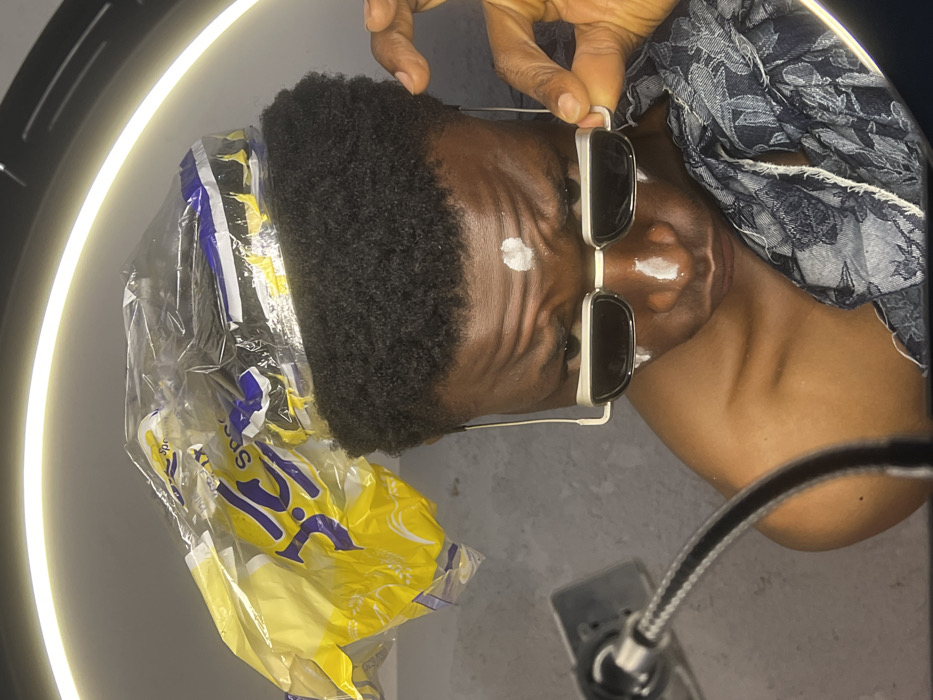 An individual with dark skin and short, afro-textured hair is depicted in an indoor setting specified as Bar Gada, Nigeria. The subject has a clear plastic bag, appearing to contain yellow and blue packaging with the partial text "Speci" and "J.I." (Arabic script), positioned on top of their head. White markings are present on the subject's forehead (circular) and on the bridge of the nose, extending under both eyes. Rectangular sunglasses with silver frames and dark lenses are worn, and the subject's left hand is visible adjusting the left temple of the sunglasses. The individual's chest is bare, with a blue and white patterned fabric draped over the left shoulder. A bright, circular ring light is visible in the upper background, providing illumination, against a plain, light grey wall. A flexible gooseneck arm, possibly for a camera or microphone, extends into the lower-left foreground.