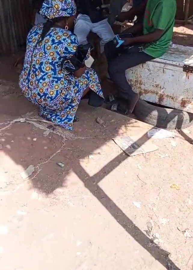 The video depicts a group of people in an outdoor setting. A woman wearing a vibrant blue and yellow patterned dress and matching headwrap is squatting and appears to be examining or handling something in her hands. A young man in a green t-shirt and dark pants is sitting on a white, rusted metal box, looking towards the others. Several other men are standing around the group, some are looking at their mobile phones. A used tire is wedged under the metal box. The ground is a mixture of dirt and litter. Sunlight streams through an overhead structure, casting distinct shadows on the ground. The overall setting seems to be a market or roadside gathering place.