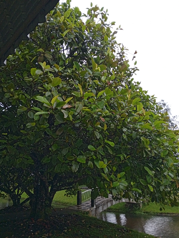A verdant tree dominates the scene, its dense canopy reaching towards a cloudy sky. The tree's trunk is thick and textured, disappearing into a bed of earth and grass. In the background, a small bridge crosses a waterway, reflecting light from the sky. The bridge is visible beneath the tree’s lower branches, providing depth to the outdoor setting.