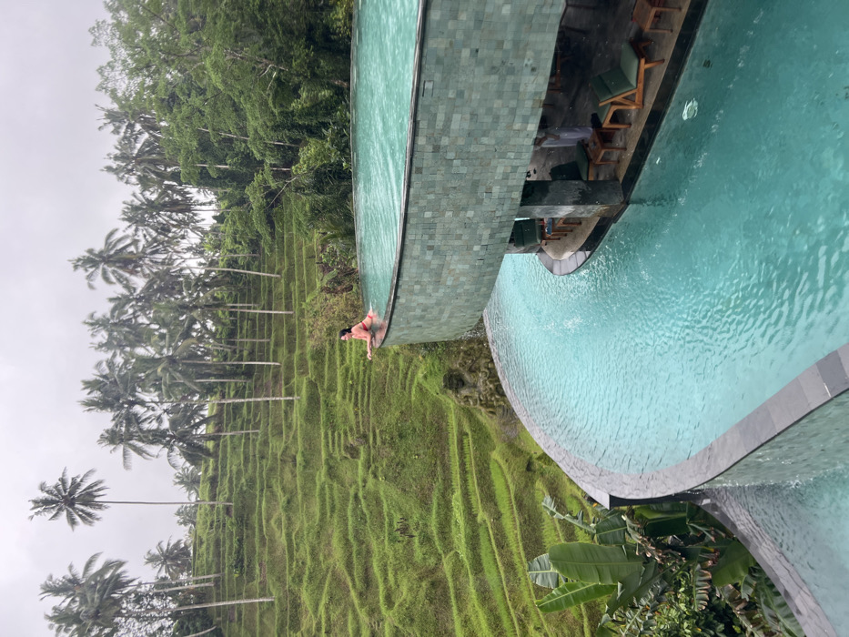 A striking image reveals a woman standing at the edge of an infinity pool overlooking lush, tiered rice paddies under a slightly overcast sky