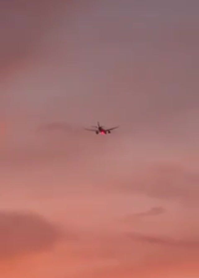 n airplane flying in the sky against a backdrop of sunset colors. The sky transitions from a dark red/orange at the bottom to lighter pink and gray at the top. The airplane is silhouetted against the sky, appearing small and distant. There are scattered clouds throughout the scene. The overall impression is one of serenity and beauty.