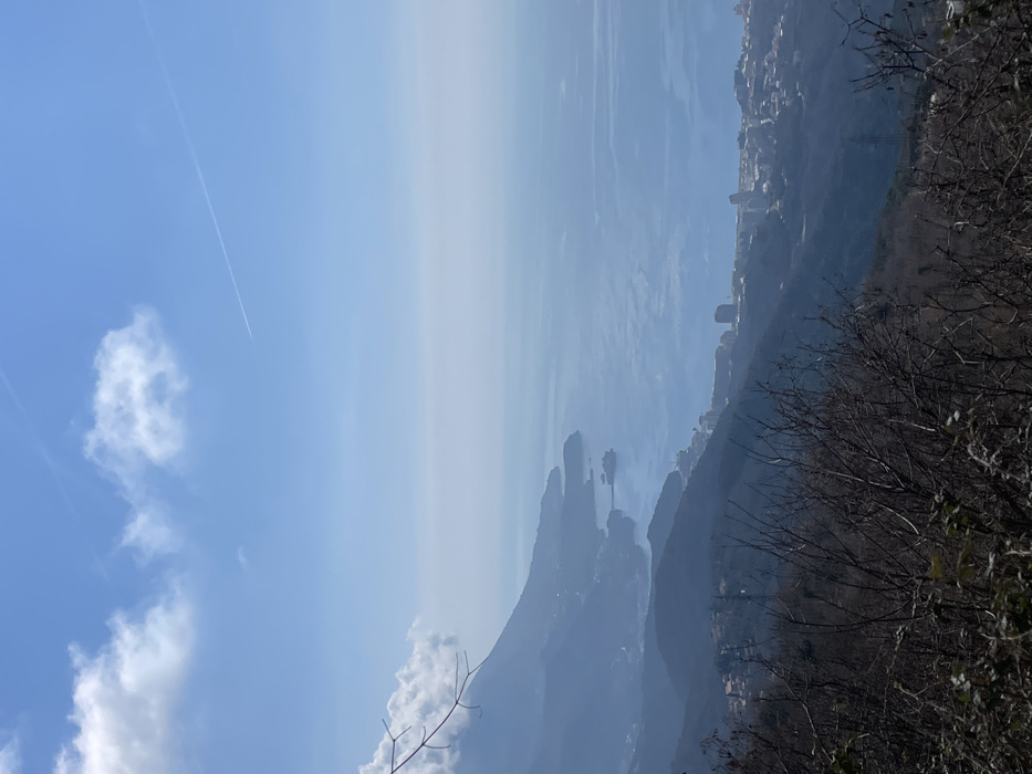 The image displays a panoramic, high-angle view of the Montenegrin coastline and the Adriatic Sea, observed from an elevated position in the Stanišići area. The immediate foreground features dark, leafless deciduous tree branches and sparse undergrowth. Beyond, successive mountainous slopes, sparsely vegetated, descend towards the coast. In the midground, a significant coastal indentation to the left reveals a large, white-hulled vessel, consistent with a cruise ship, either docked or anchored within a bay. Further along the coastline to the right, a dense urban area, identifiable as Budva, is visible, comprising numerous buildings of varying heights, including several prominent multi-story structures clustered along the shore. The Adriatic Sea, appearing calm and reflecting the clear sky, extends from the coastline to the horizon, exhibiting shades of blue with subtle surface variations. The background consists of a clear, light blue sky with scattered white cumulus clouds, some of which are partially obscured by a mountain peak on the far left. A faint, white aircraft contrail is present diagonally across the upper right portion of the sky. No individuals, specific actions, or interactions are discernible within the scene. The environment is characterized by clear daylight and atmospheric haze diminishing visibility of the most distant elements.