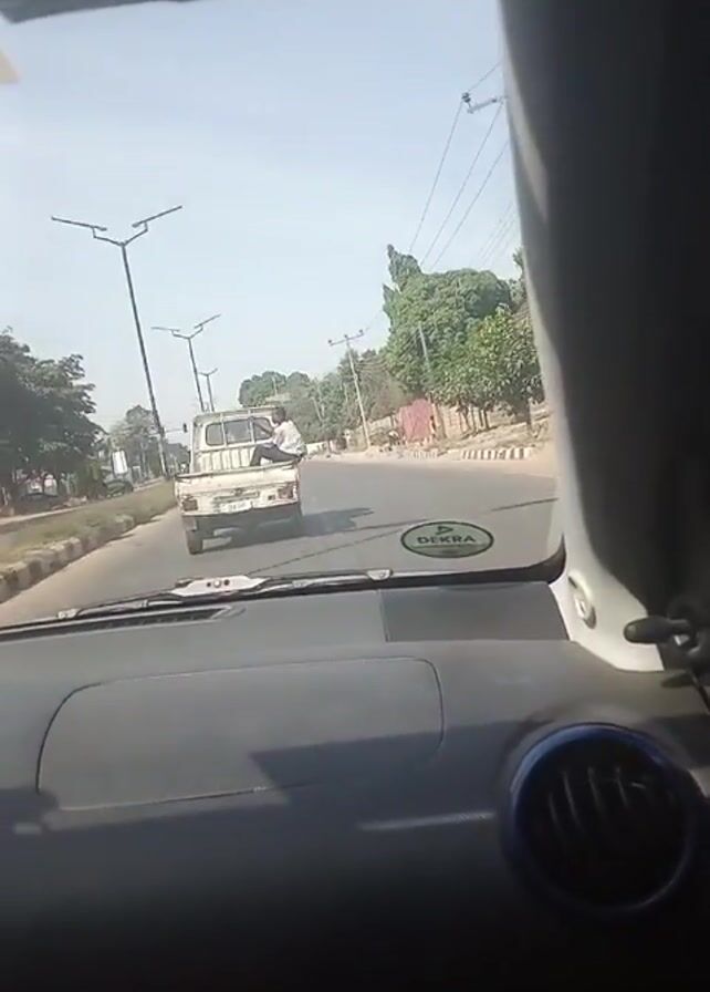 view from the interior of a car, looking forward through the windshield. The car is driving on a road with street lights. A white pickup truck is ahead. There appears to be a person sitting in the bed of the truck. Trees and buildings line the side of the road. The sky is visible and appears clear and bright. A "DEKRA" sticker is visible on the windshield.