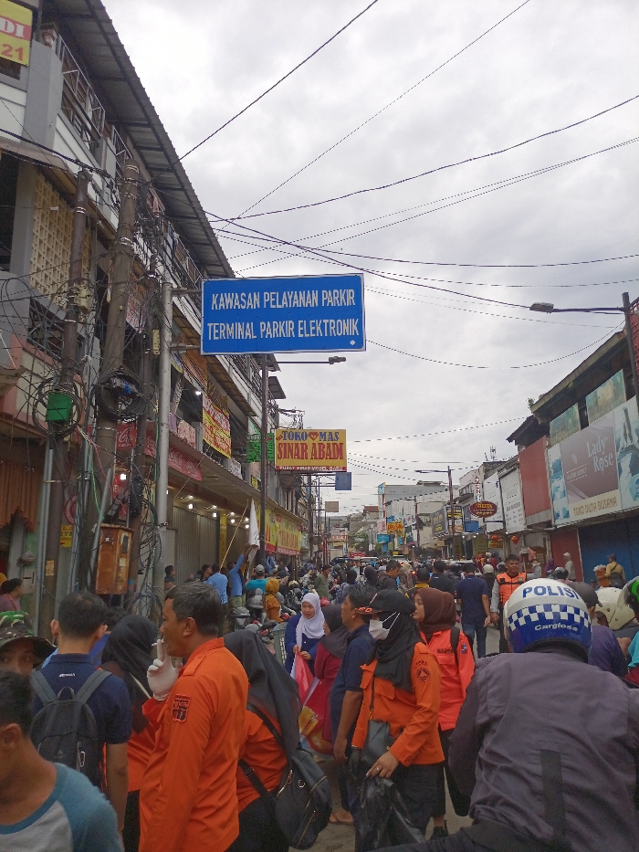 A busy street scene under a cloudy sky, densely populated with people. A parking sign reads "KAWASAN PELAYANAN PARKIR TERMINAL PARKIR ELEKTRONIK," indicating an electronic parking terminal area. Various shops line the street, including a gold shop called "TOKO MAS SINAR ABADI" and a women's clothing store called "Lady Rose." Many people are wearing orange shirts, likely emergency personnel, while others are wearing everyday clothes. A motorcyclist wearing a "POLISI" helmet is also present. Overhead, tangled power lines create a web against the sky.