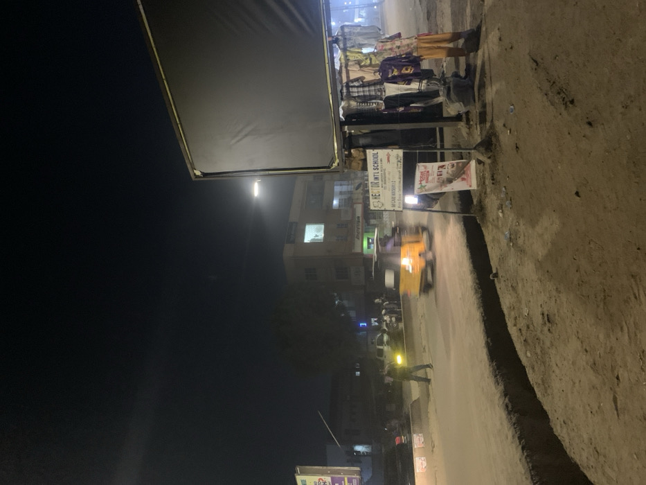 Night street scene with a brightly lit building visible in the background. An auto-rickshaw is blurry in motion on the road. A clothing rack stands at the roadside, under the large rectangular sign. A pedestrian walks on the road, illuminated by streetlights. The roadside is uneven.