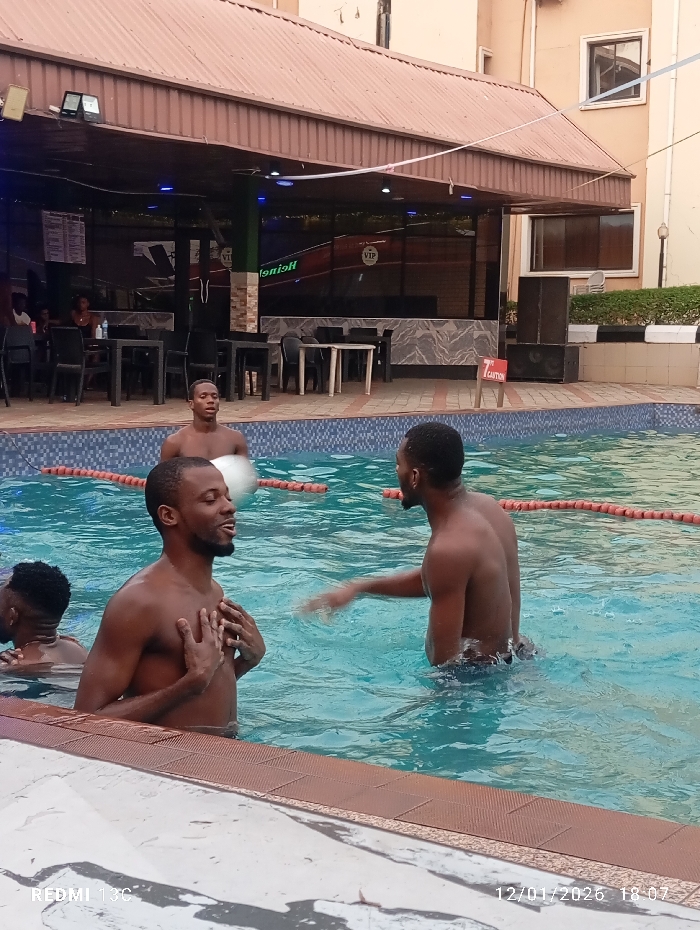 Four men are in a swimming pool. Three of them are visible from the chest up, and one man has his back to the camera. The pool has a safety rope with red and white floats. Behind the pool is a bar or lounge area with tables and chairs. There is a building behind the bar. The pool deck is visible in the foreground.