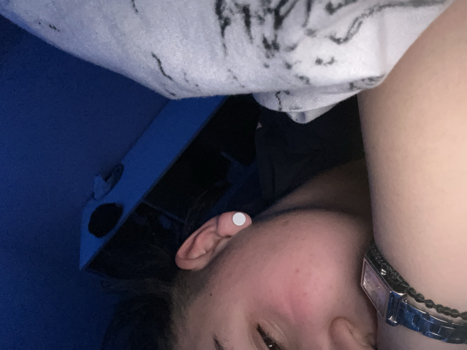 The image displays a close-up perspective of an individual in an indoor, low-light environment, predominantly illuminated by a blue hue. The left side of a person's face is visible, featuring a partial dark eye, a slightly flushed cheek, and a visible left ear with a small, round white stud earring. Dark hair is pulled away from the ear. A small metallic piercing is visible above the left eye. The individual's left arm is present in the lower frame, adorned with a silver-toned wristwatch featuring a rectangular face and a link band, worn alongside a dark beaded bracelet. The person is positioned adjacent to a white fabric, possibly a blanket or pillow, with a dark, abstract pattern. In the background, to the upper left, a blue surface, possibly a shelf or furniture, is visible, angled diagonally, with a dark, indistinct object resting upon it. The specific location within Karlovo, Bulgaria, cannot be determined from the visual information provided.