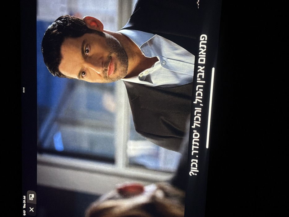 The image displays a digital screen captured at an angle, showing a video scene from the television series "Lucifer