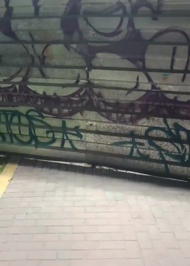 The camera focuses on a rolling metal door covered in graffiti