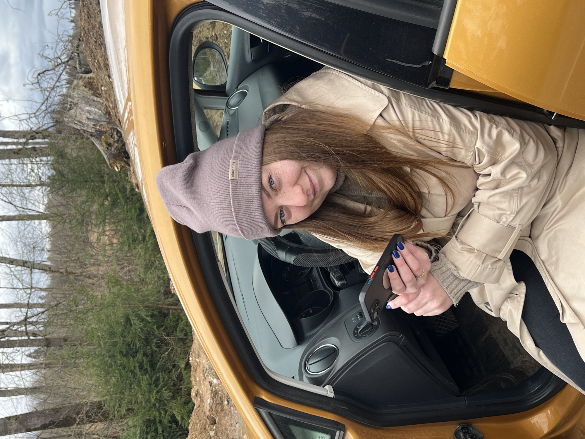 A woman with long brown hair and blue eyes, wearing a gray beanie and beige trench coat, is seated in the driver's seat of a gold-colored car. She is holding a black cell phone in her hands, her fingernails painted blue. The car door is open, and the exterior reveals a wooded area with bare trees and some green foliage. The scene appears to be outdoors, with an overcast sky. The location is stated to be Ivlevo, Russia, though this cannot be confirmed from the image.