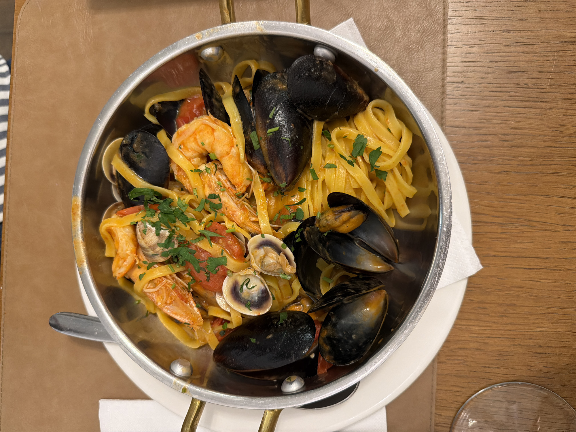 - "A top-down shot depicts a metal serving pan of seafood pasta dish centered on a wooden table" by FM-MdWQa2, licensed under CC BY 4.0
