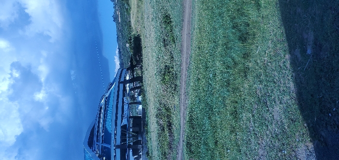 The image displays an outdoor scene within Hells Gate ward, Kenya, characterized by a dominant cloudy sky. In the left middle ground, a large, modern building features a distinctive, multi-tiered, curved roof structure composed of blue or teal panels. The building's base shows support columns and open spaces. The foreground and middle ground consist of unkempt grassy terrain with variations in green and dry patches. A horizontal dirt path or track traverses the middle ground. The background reveals distant hills covered with vegetation and some scattered structures. No individuals are present, and no specific actions or interactions are depicted. The scene is illuminated by natural light, casting subtle shadows.