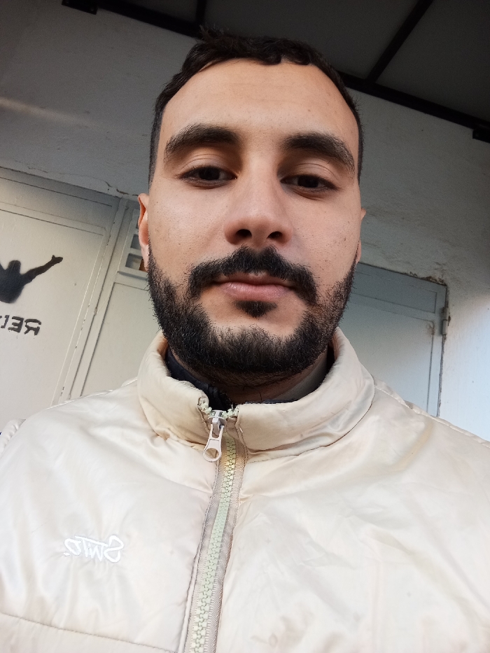 A man with dark hair, thick eyebrows, and a beard looks directly at the camera. He wears a light-colored puffer jacket with a zipper. Behind him is a white door with what appears to be a black silhouette of a person raising their arms and some reversed text. The background has a neutral tone, suggesting an outdoor or semi-outdoor setting.