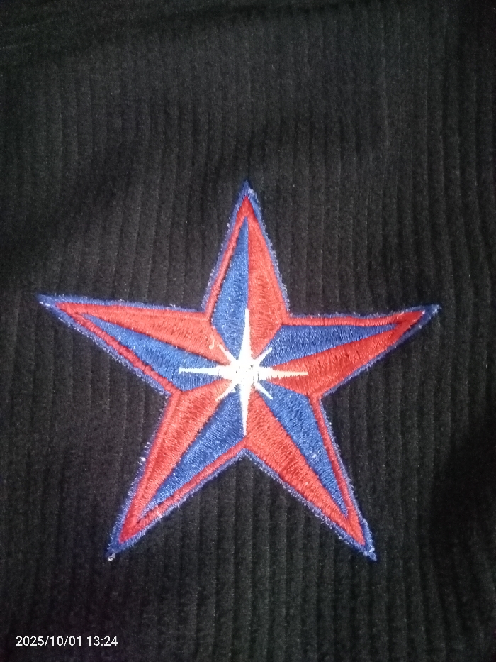 A close-up image displays an embroidered five-pointed star emblem against a dark, vertically ribbed fabric, identified as being in Thuthuriki, Kenya. The star features alternating red and blue sections within its points, outlined by a thin light blue embroidery stitch. A white starburst design, composed of radial white stitches, is centered within the star. The background fabric is dark, possibly black or very dark blue, exhibiting a distinct corduroy or ribbed texture. The embroidery is precise, with visible thread texture. No individuals or objects other than the embroidered fabric are present. An embedded timestamp, "2025/10/01 13:24," appears in the lower-left corner of the image.