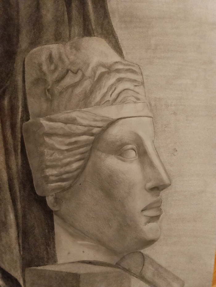 - "This image presents a monochrome drawing, rendered in charcoal or graphite on light brown paper, depicting a classical female bust in right profile" by FM-4AUD52, licensed under CC BY 4.0